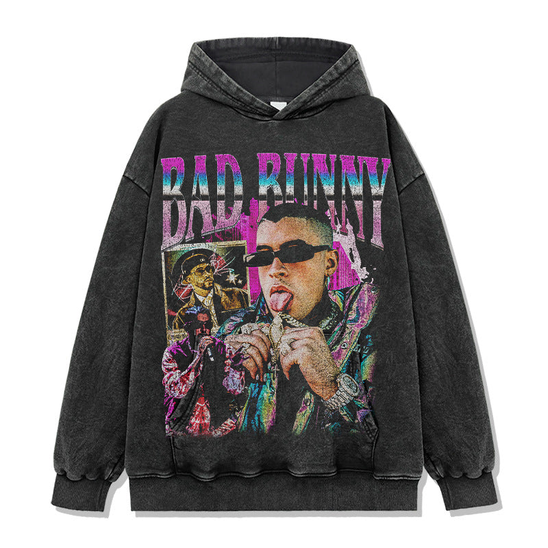 Bad Bunny Printed Short Sleeve T-Shirt Washed Long Sleeve Loose Casual Hooded Sweater Men