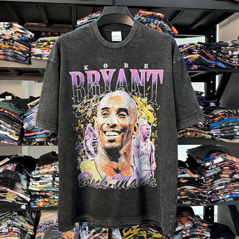 Crew neck Kobe printed short-sleeved T-shirt retro high street washed loose heavy cotton small neckline trendy t