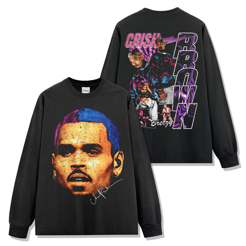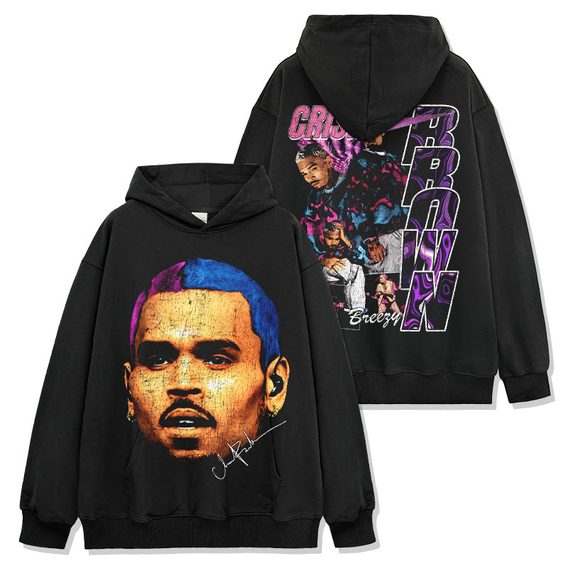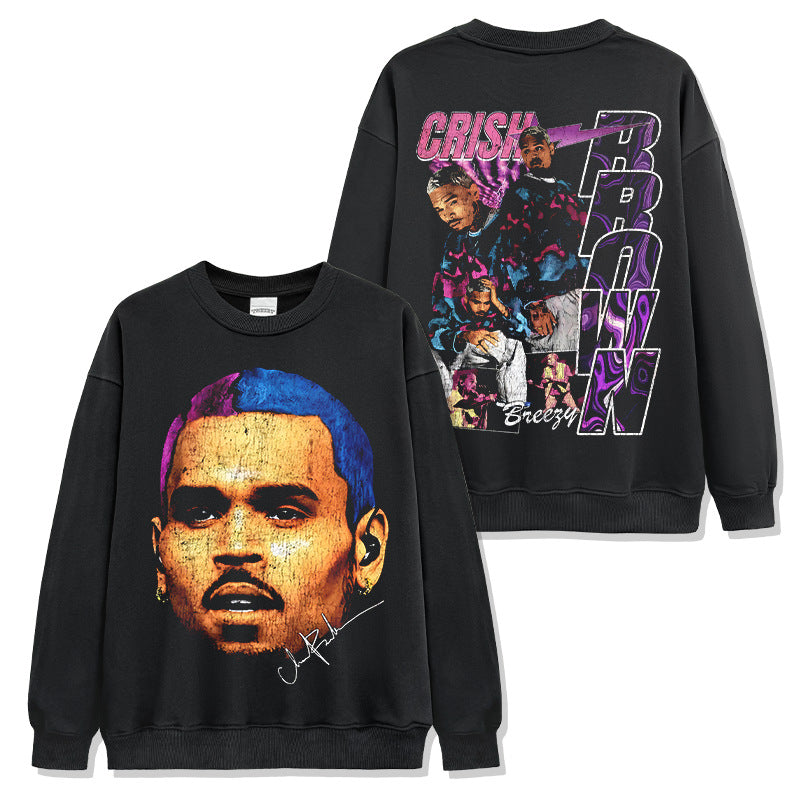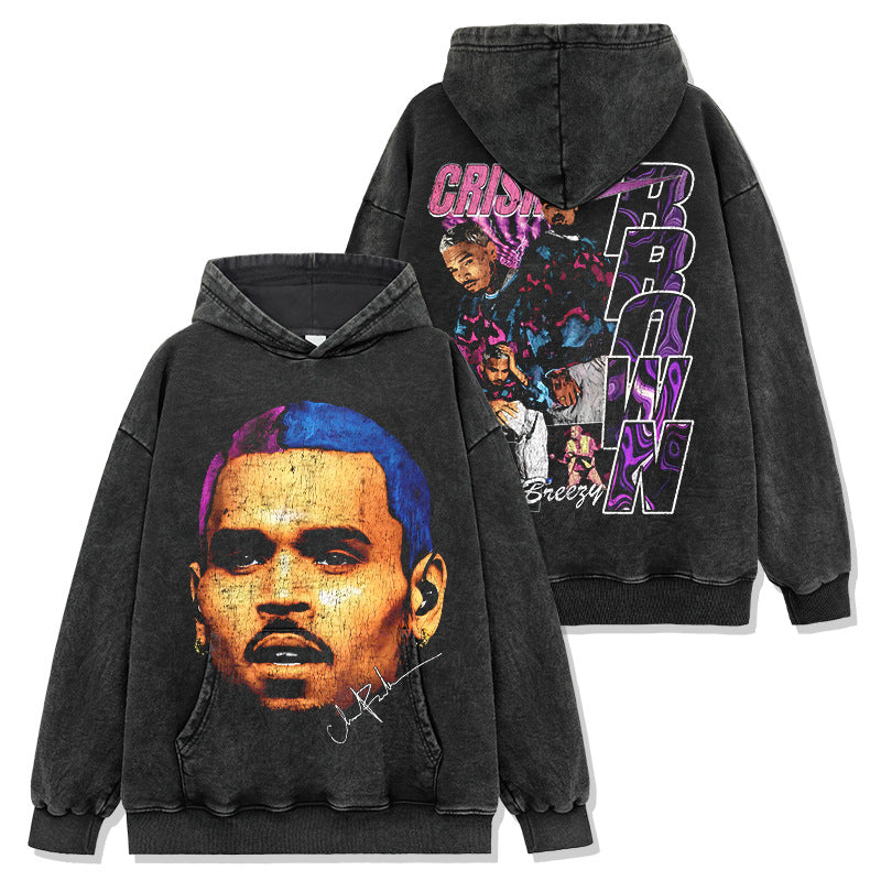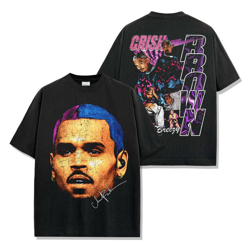Hip Hop Brown Chris Brown Printed Washed Short Sleeve T-Shirt Crew Neck Heavy Loose Hooded Sweater Men