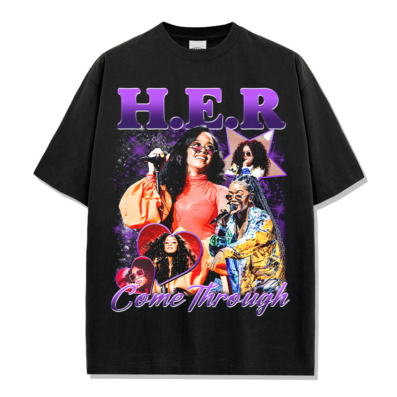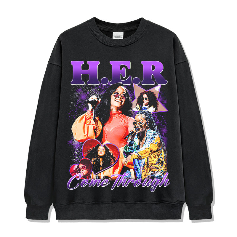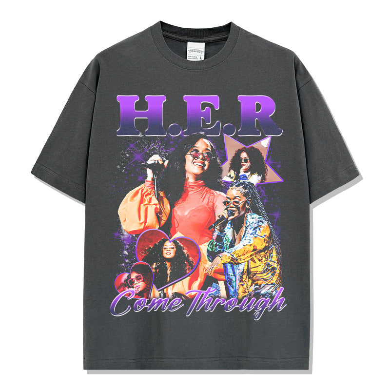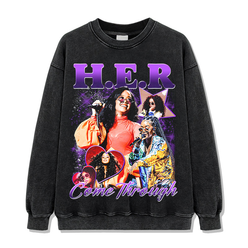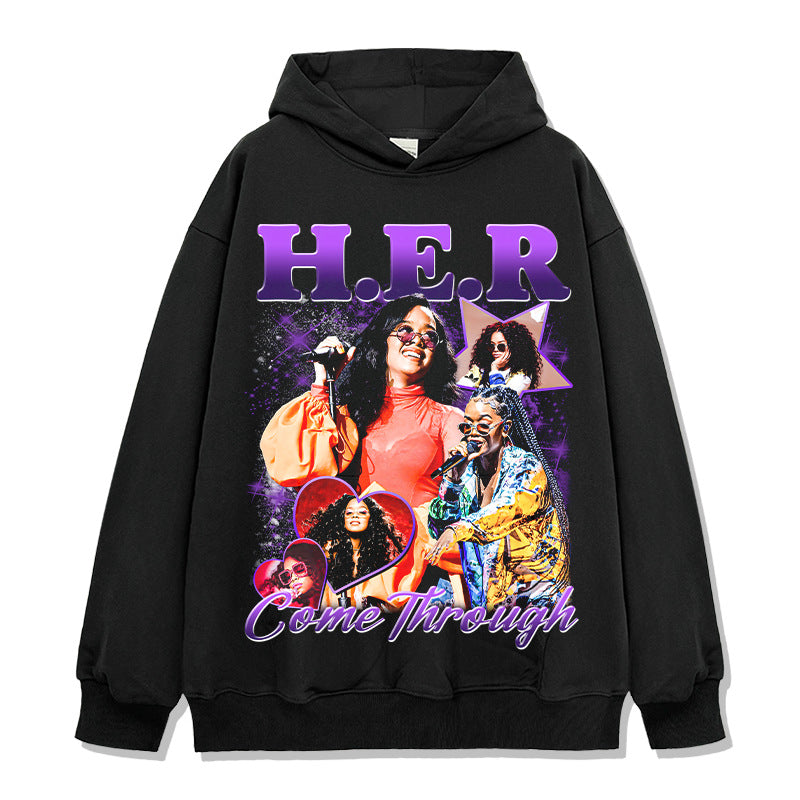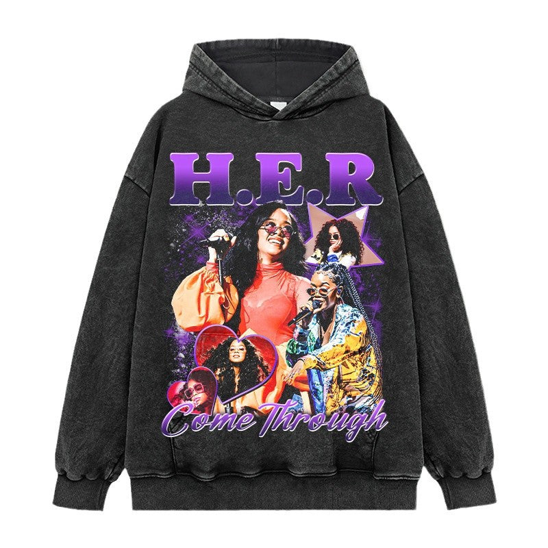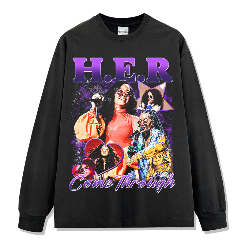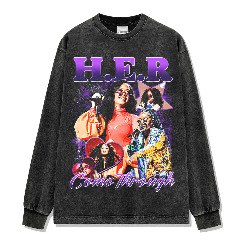Hip Hop HER Printed Short Sleeve T-Shirt Washed Old Long Sleeve Loose Casual Heavy Hooded Sweater Men