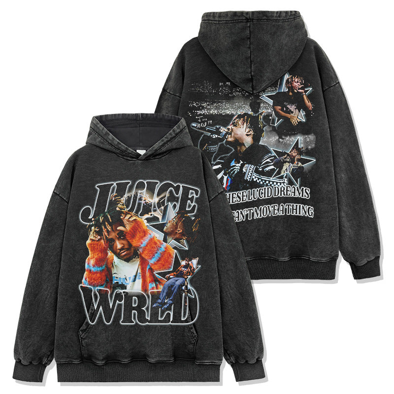 Hip Hop JUICE WRLD Double-Sided Printed Washed Short Sleeve T-Shirt Loose Crew Neck Hooded Sweater Men