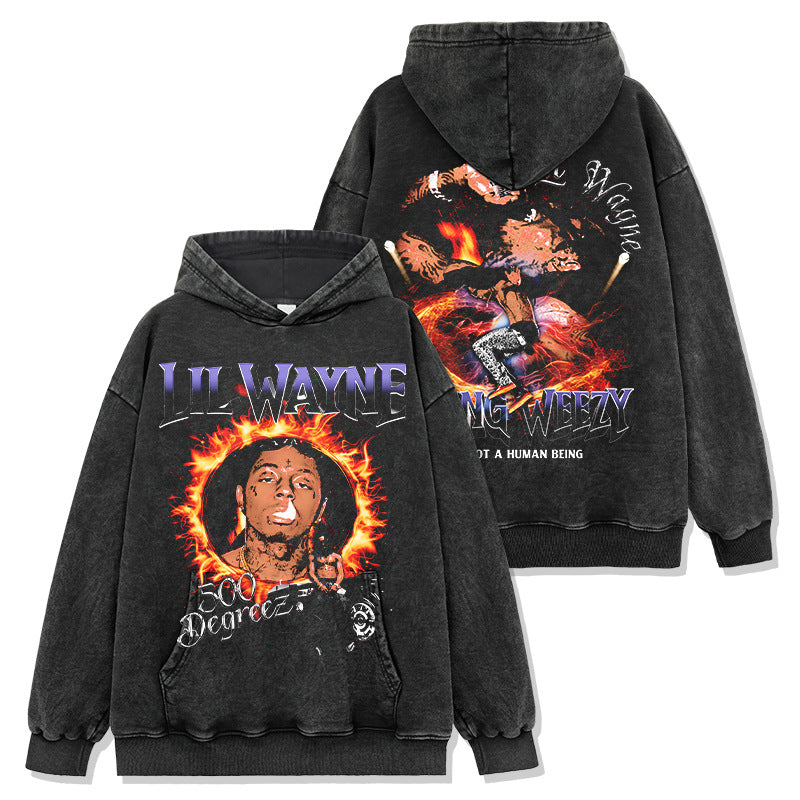 Hip Hop Lil Wayne Printed Washed Short Sleeve T-Shirt Crew Neck Loose Hooded Sweater