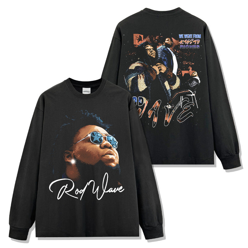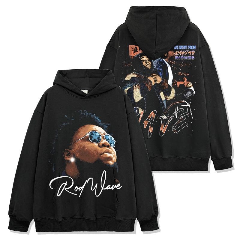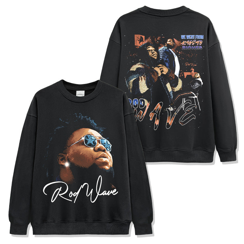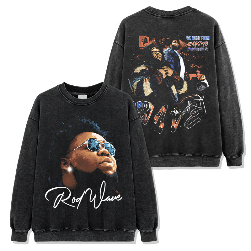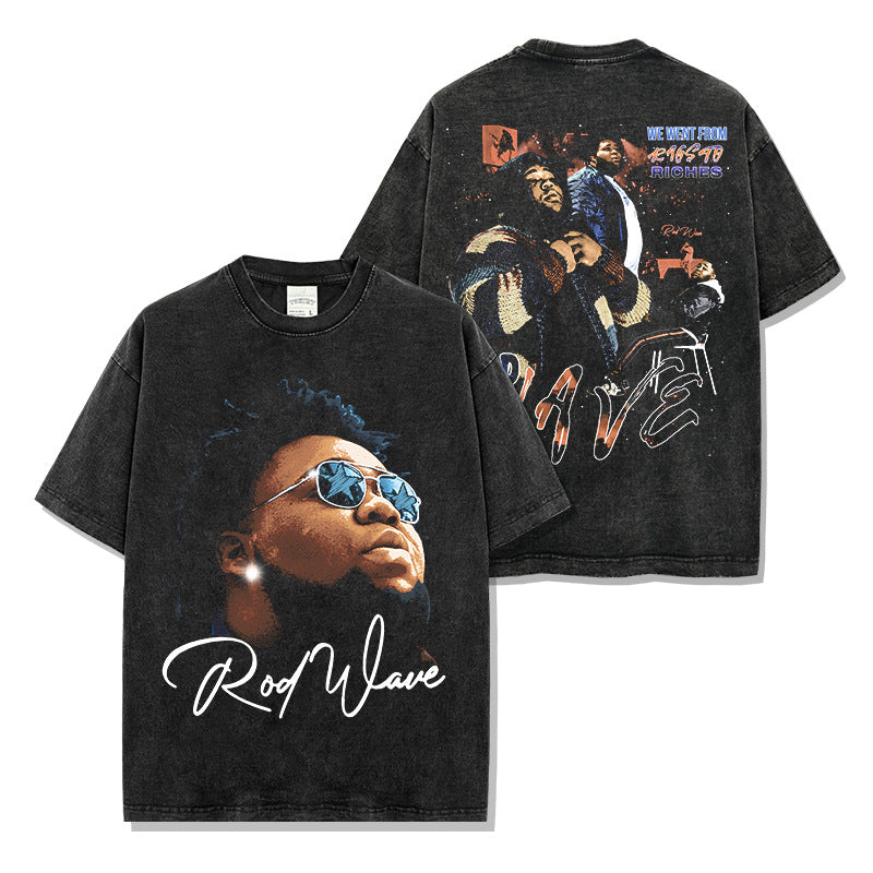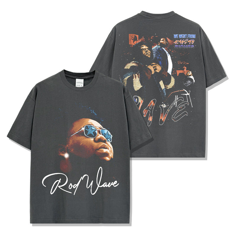 Hip-hop Rod Wave double-sided printed washed short-sleeved T-shirt with loose crewneck hooded sweatshirt