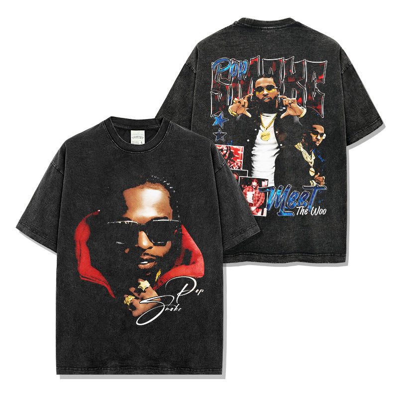 Hip Hop Smoke Print Short Sleeve T-Shirt Washed Long Sleeve Loose Hooded Sweater Men