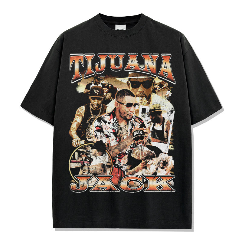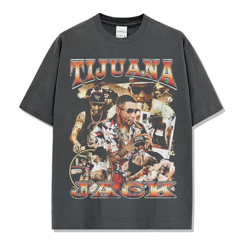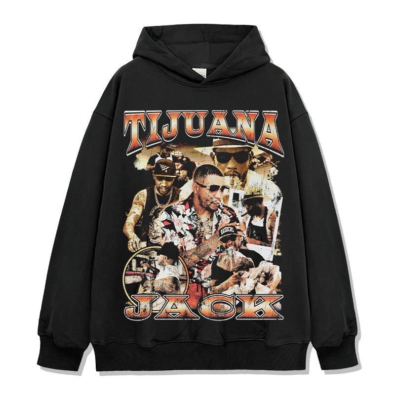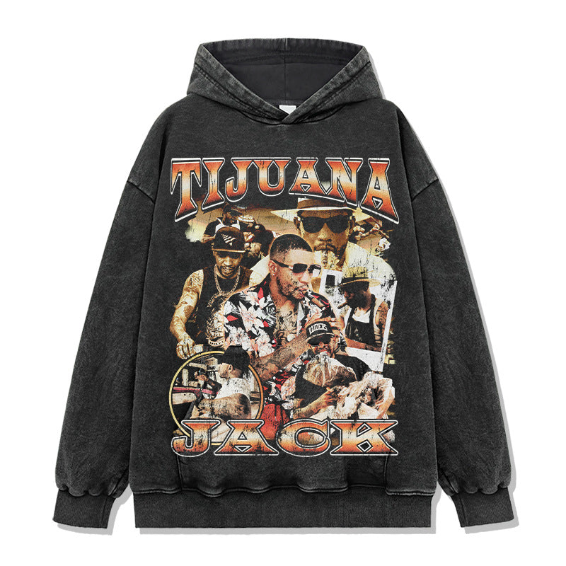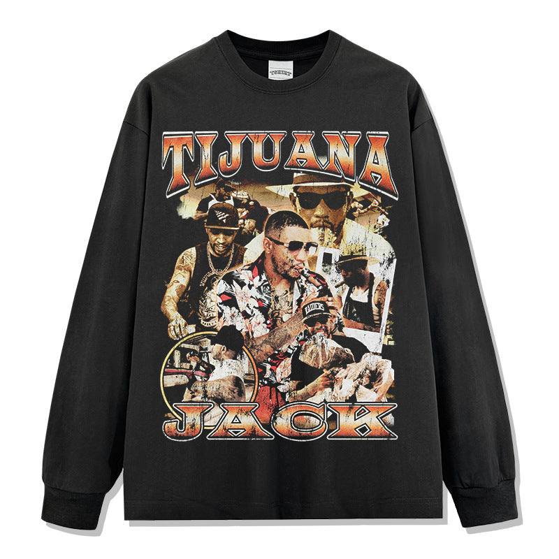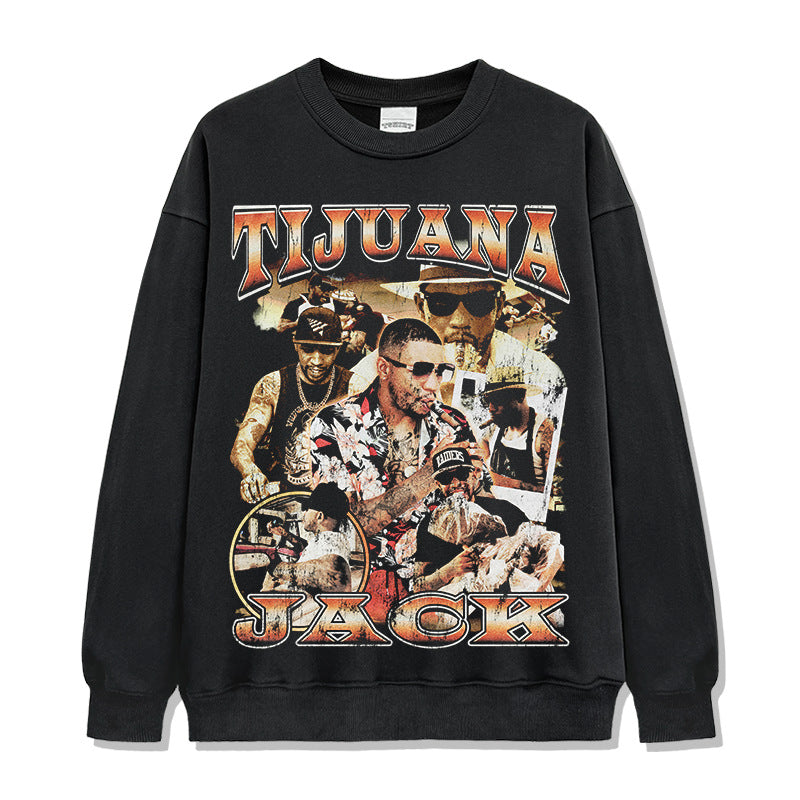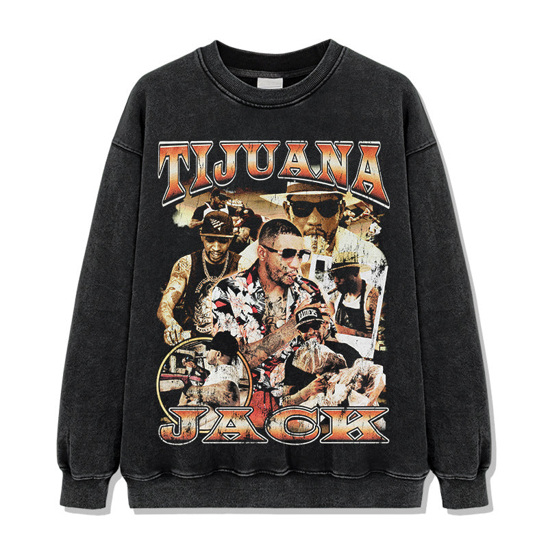Hip Hop Tijuana Jack Printed Short Sleeve T-Shirt Washed Long Sleeve Loose Heavy Hooded Sweater