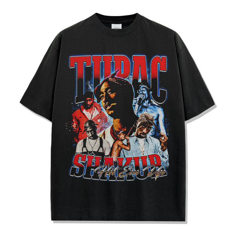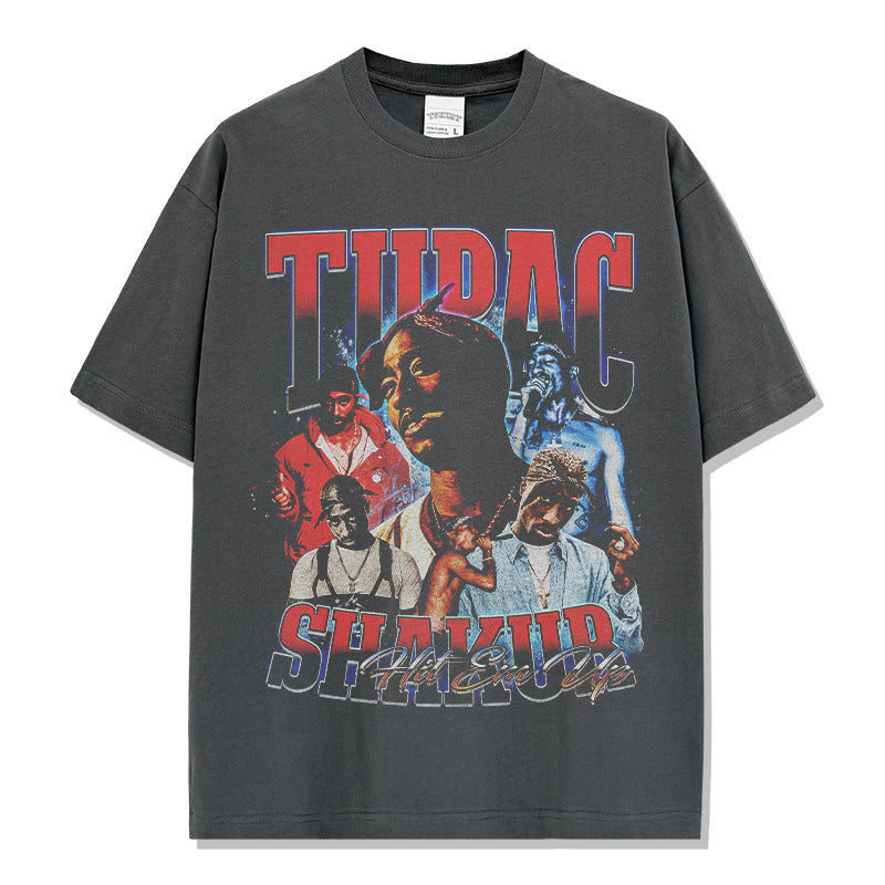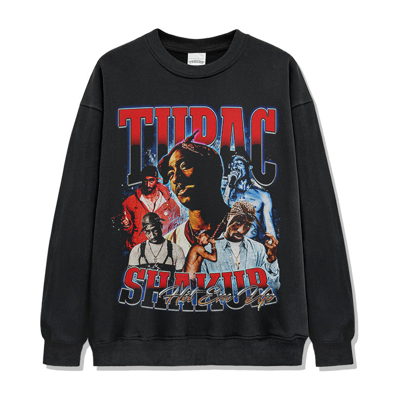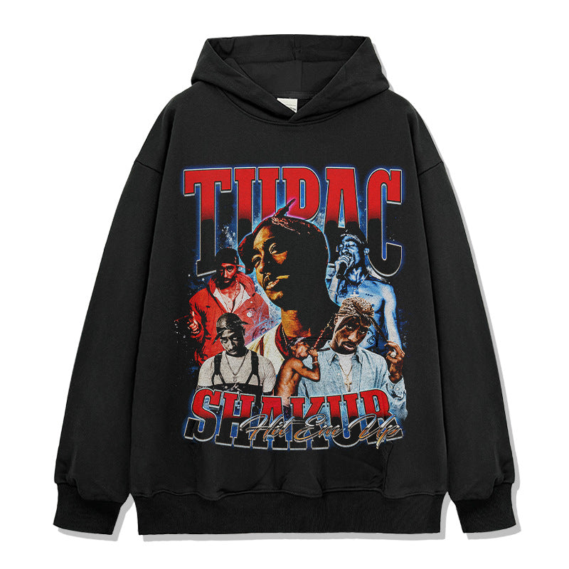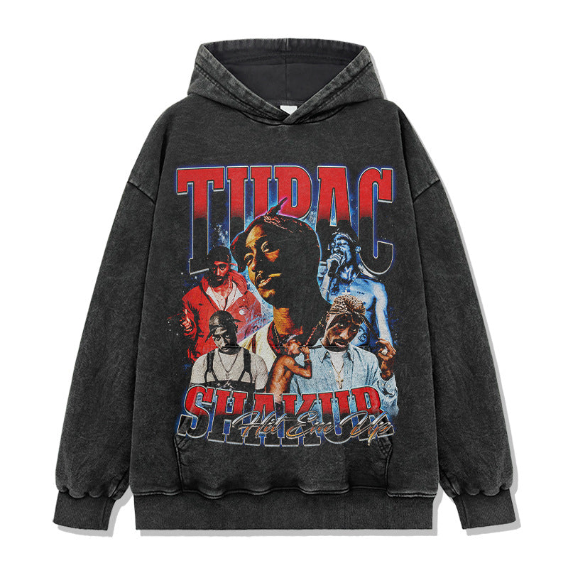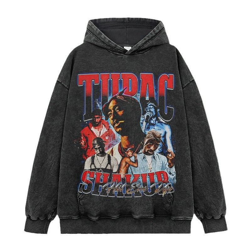 Hip Hop Tupac Printed Short Sleeve T-Shirt Washed Old Long Sleeve Loose Heavy Hooded Sweater Men