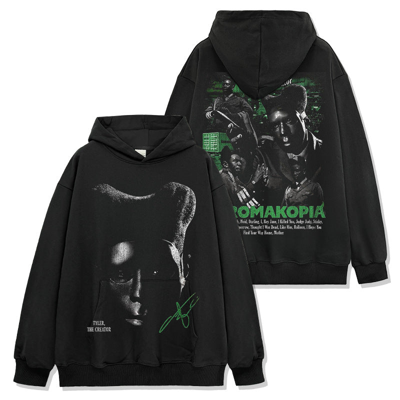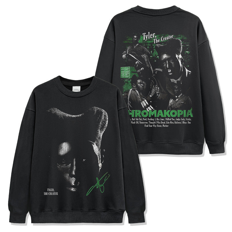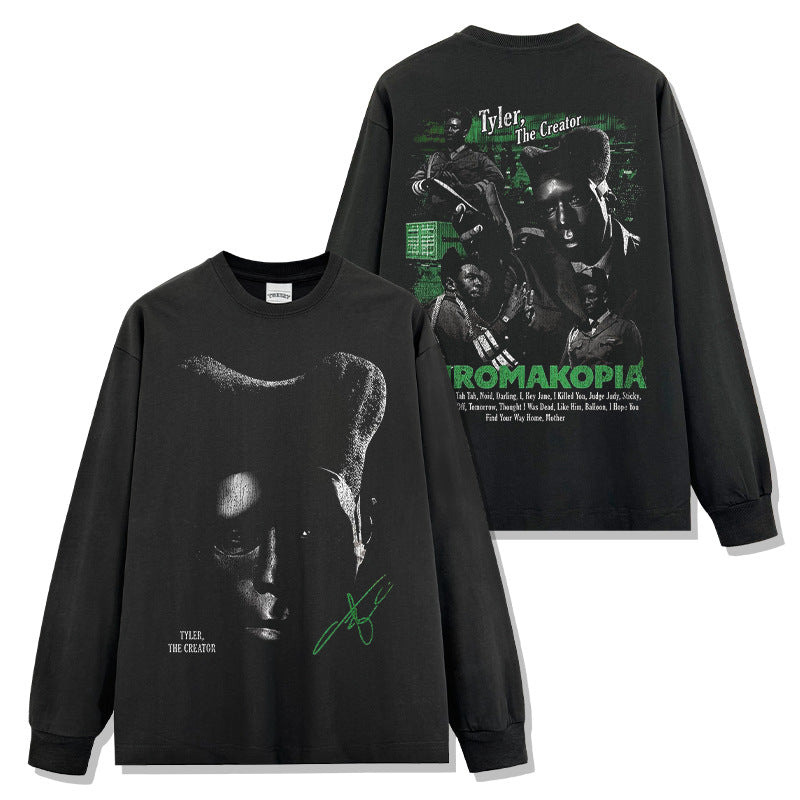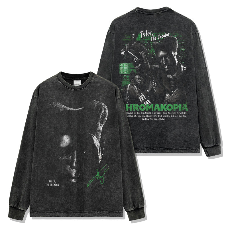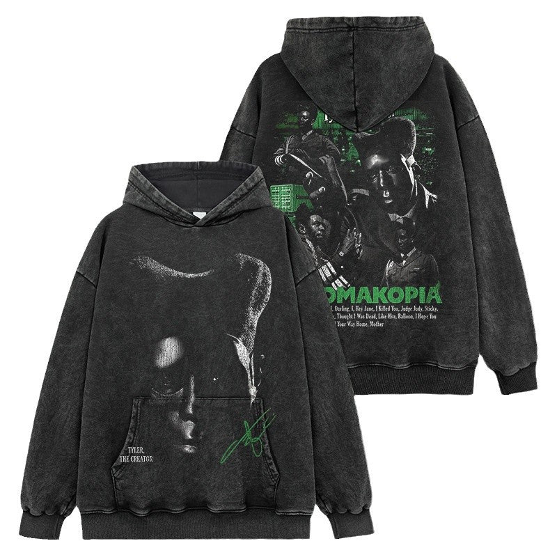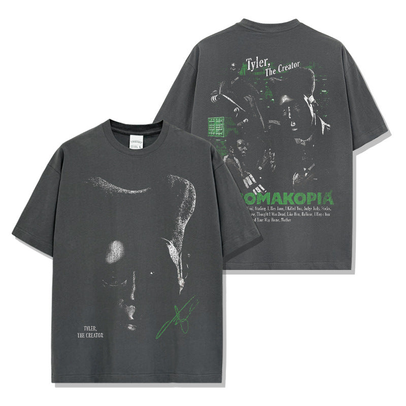 Hip Hop Tyler The Creator Printed Washed Short Sleeve T-Shirt Heavy Crew Neck Hooded Sweater