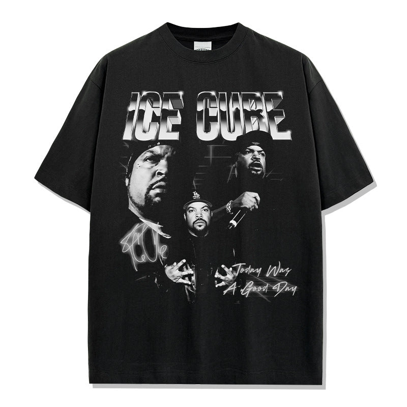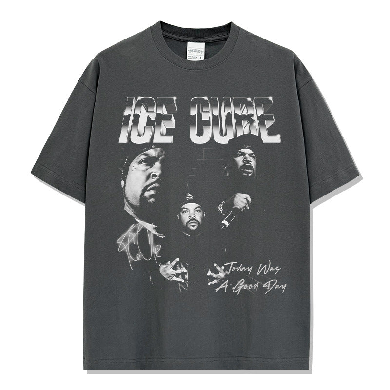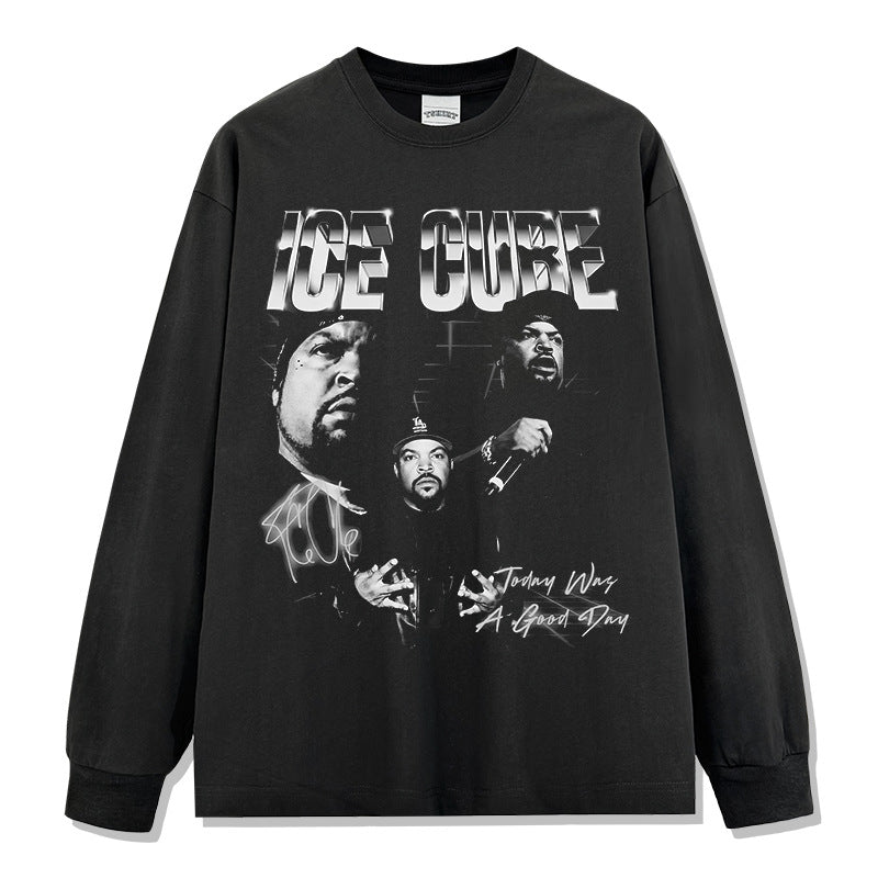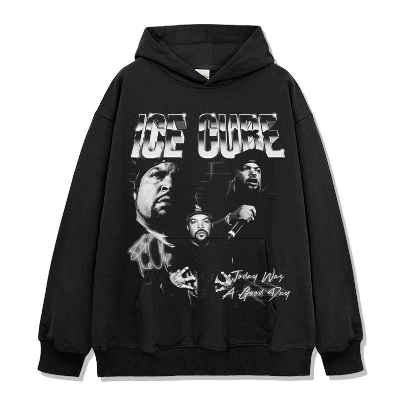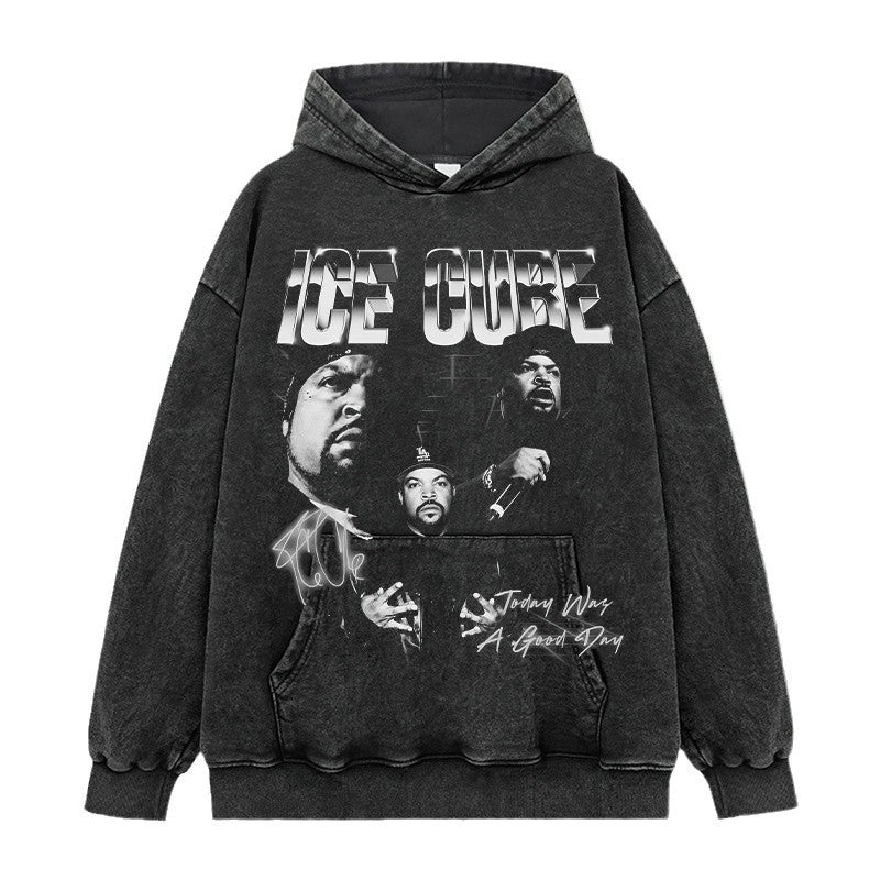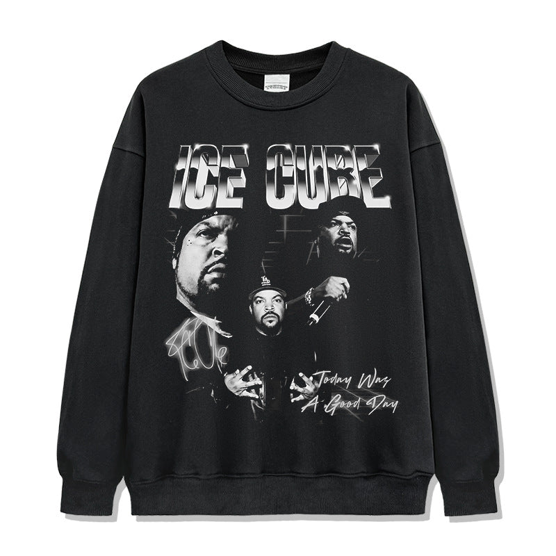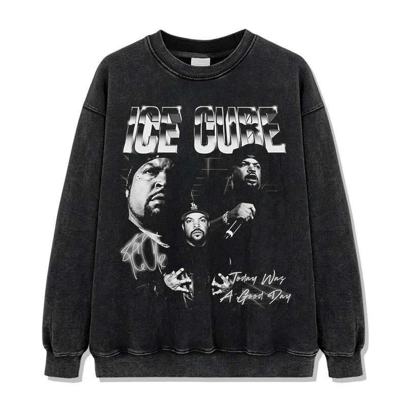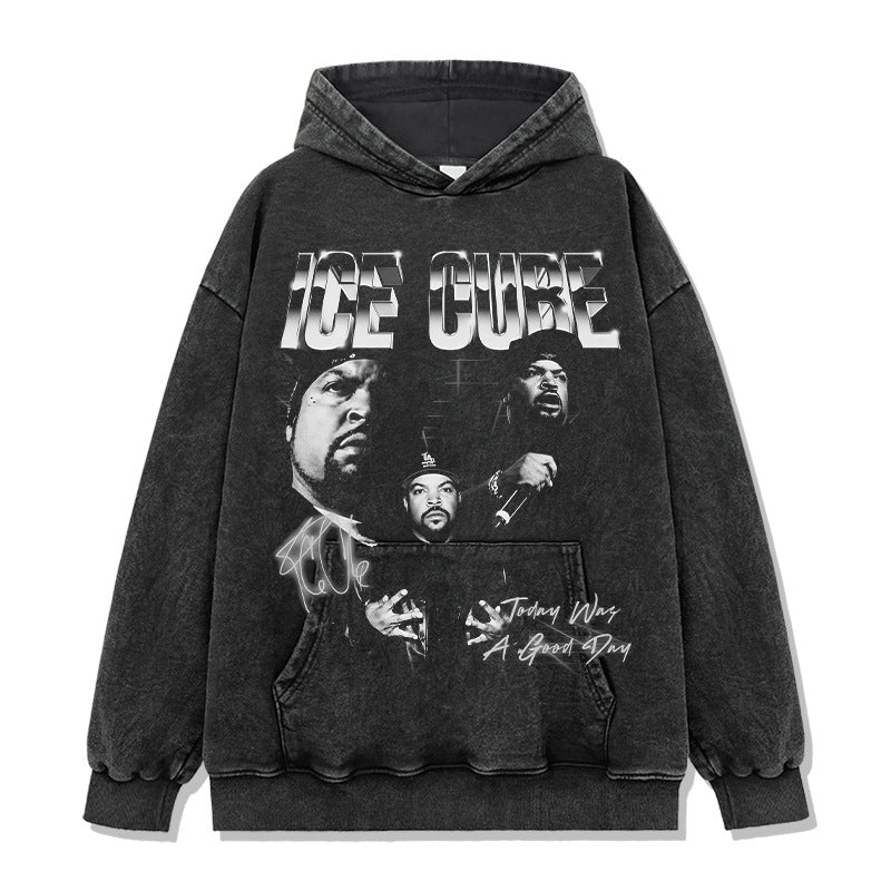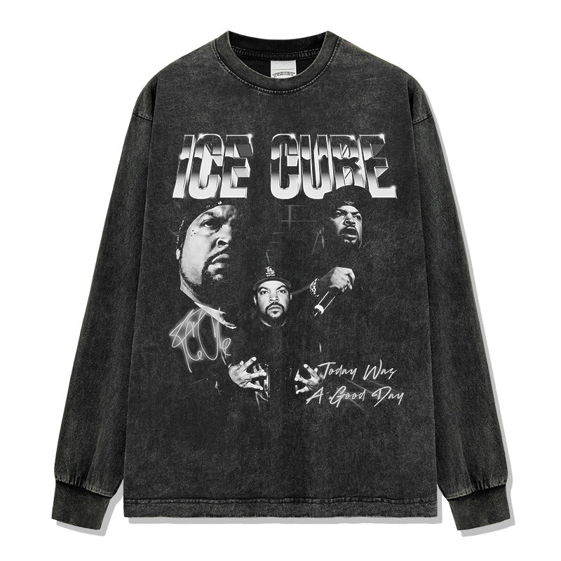 Ice Cube Printed Short Sleeve T-Shirt Washed Long Sleeve Loose Hooded Sweater Men