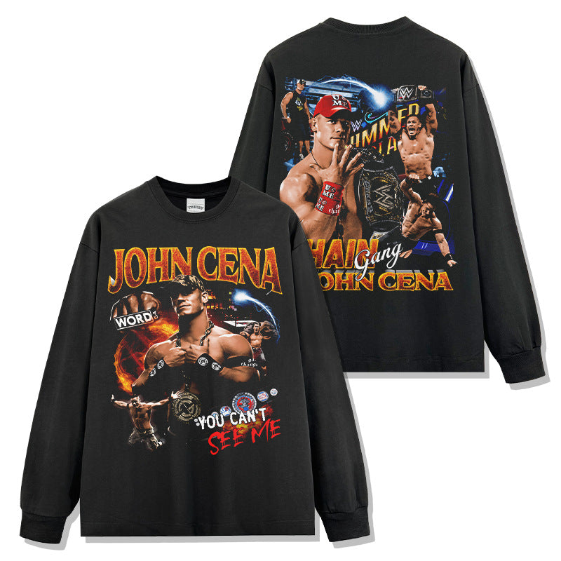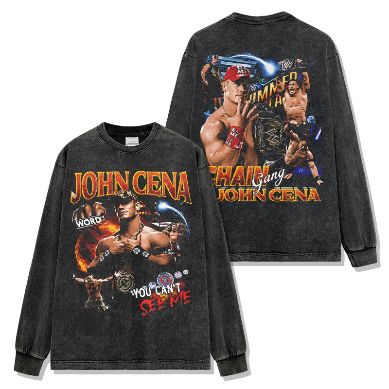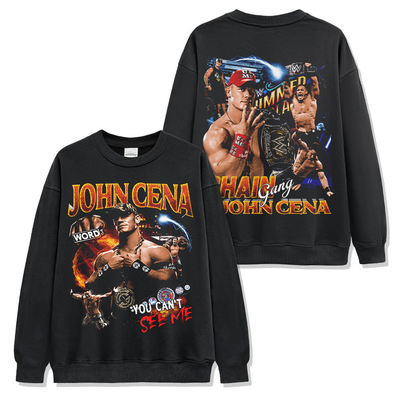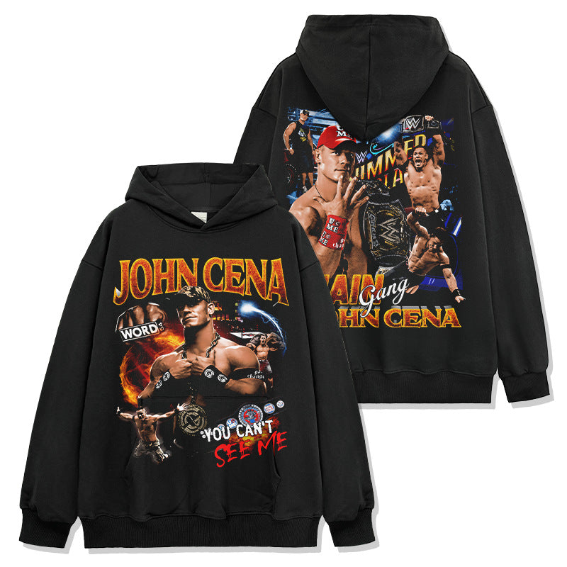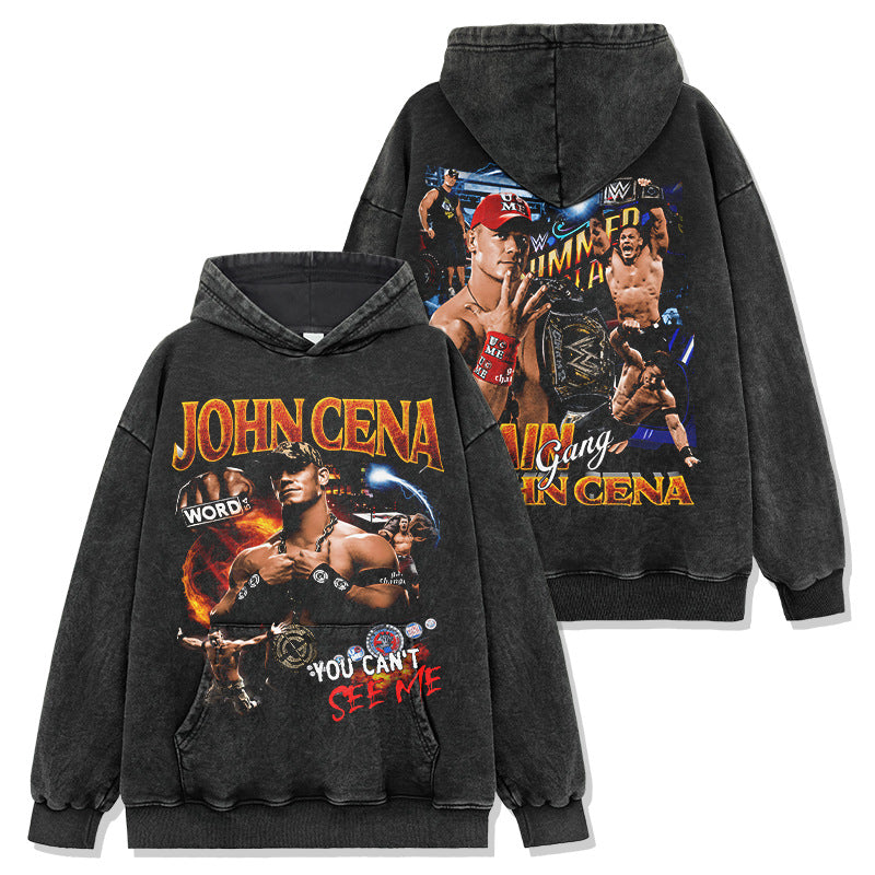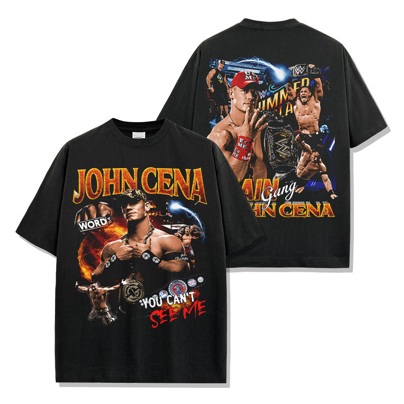 JOHN CENA John Cena print washed short-sleeved T-shirt round neck loose hooded sweater men