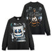 Retro-inspired graffiti letter prints and patch decoration at hem.