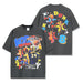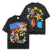 Retro-inspired graffiti letter prints and patch decoration at hem.