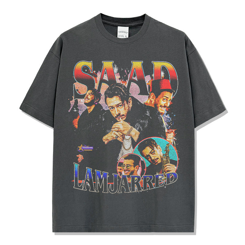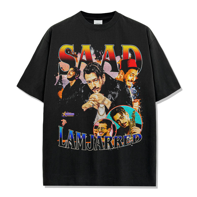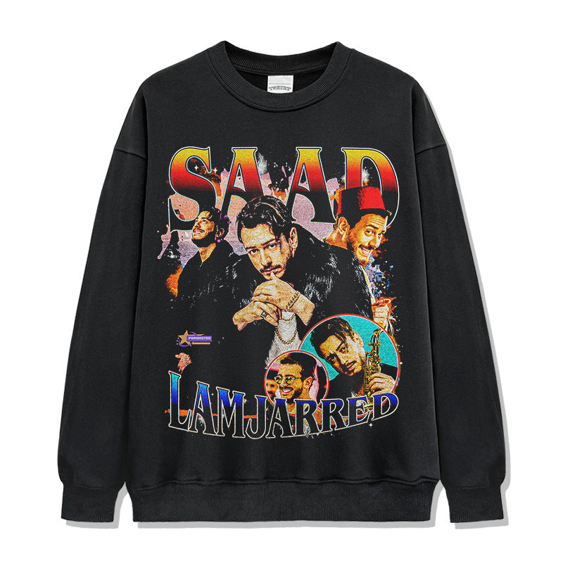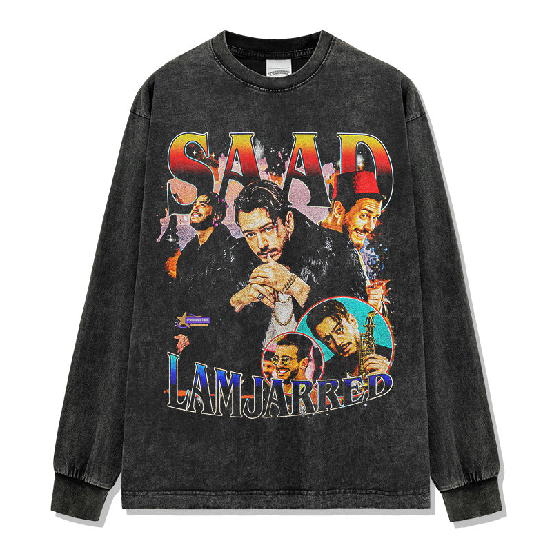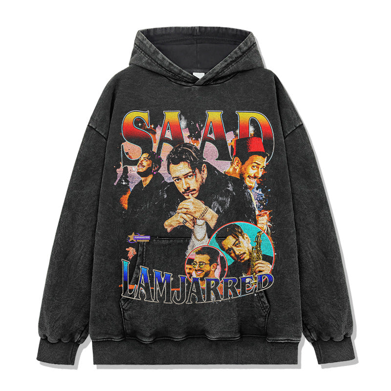 Saad Lamjarred Printed Short Sleeve T-Shirt Washed Old Long Sleeve Loose Hooded Sweater Men