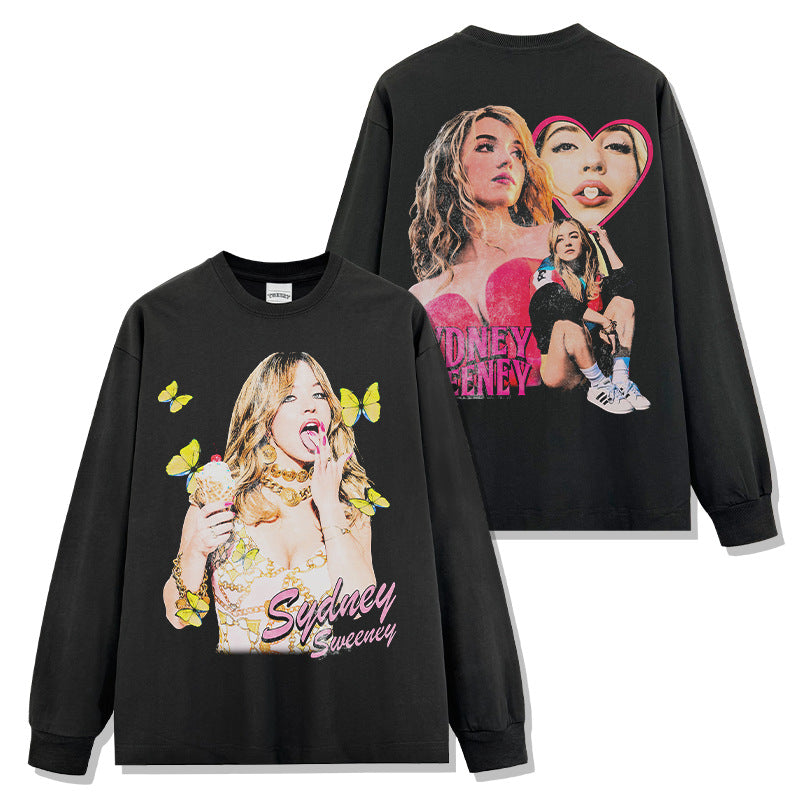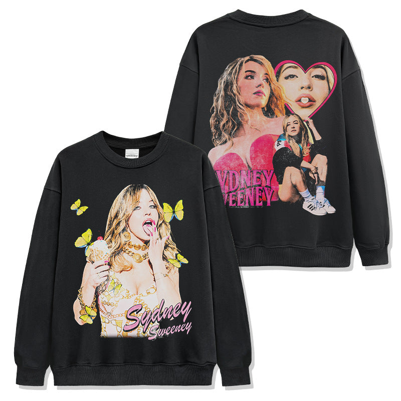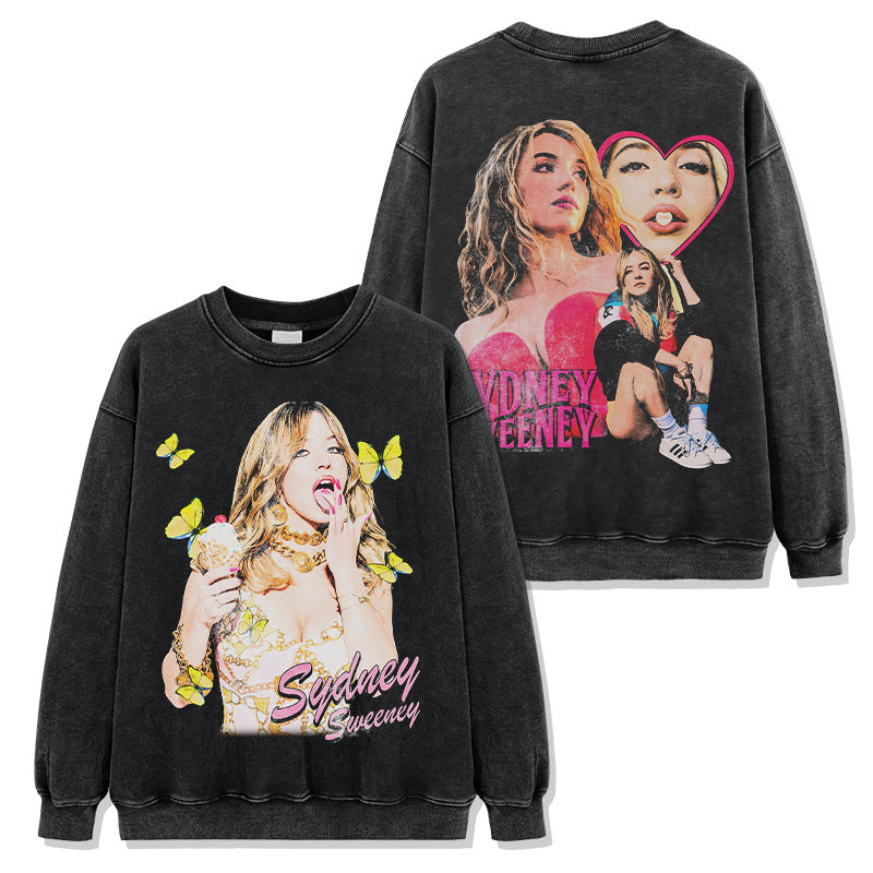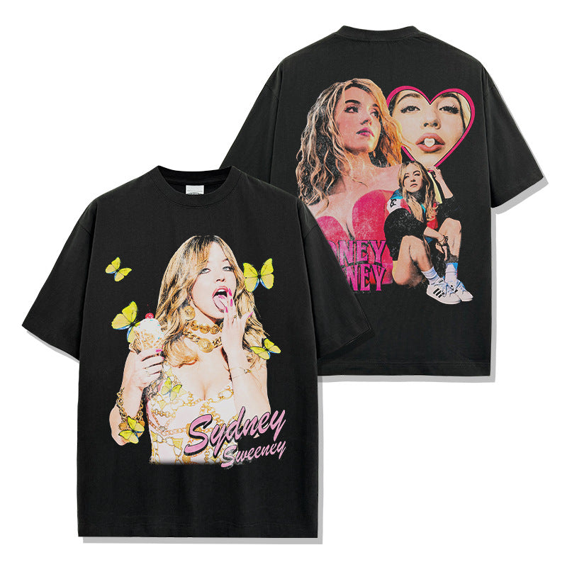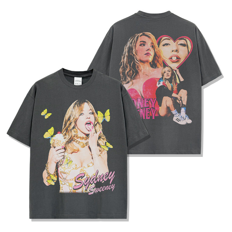 Sydney Sweeney Printed Washed Short Sleeve T-Shirt Casual Crew Neck Hooded Sweater