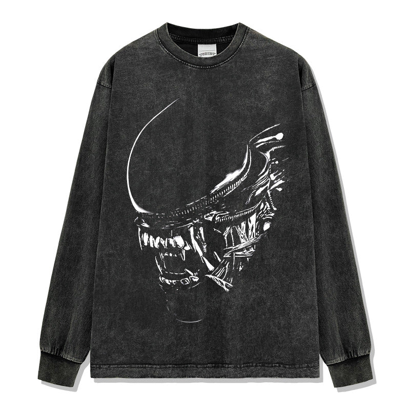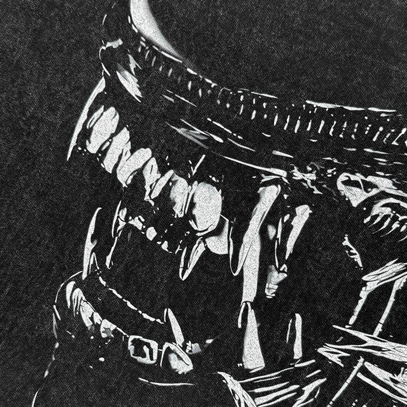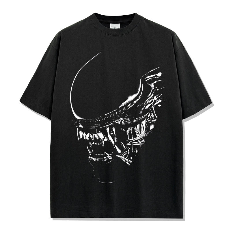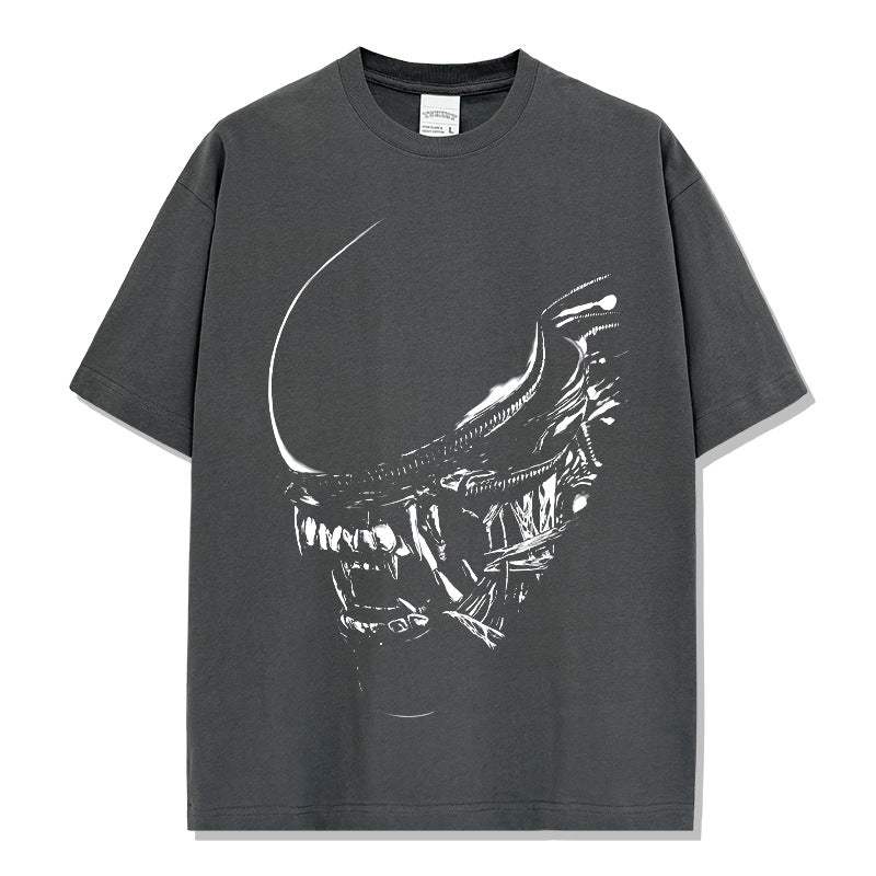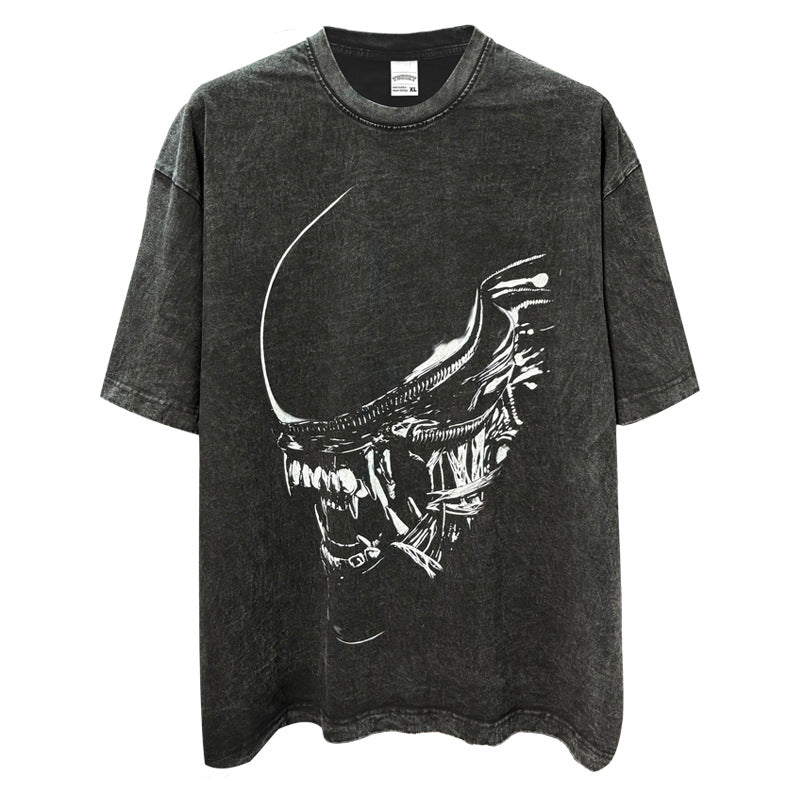 Vintage Alien Xenomorph Printed T-Shirt Vintage Washed Loose Heavy Crew Neck Short Sleeve