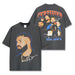 Retro-inspired graffiti letter prints and patch decoration at hem.