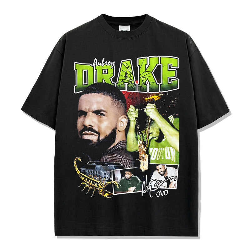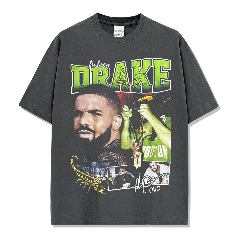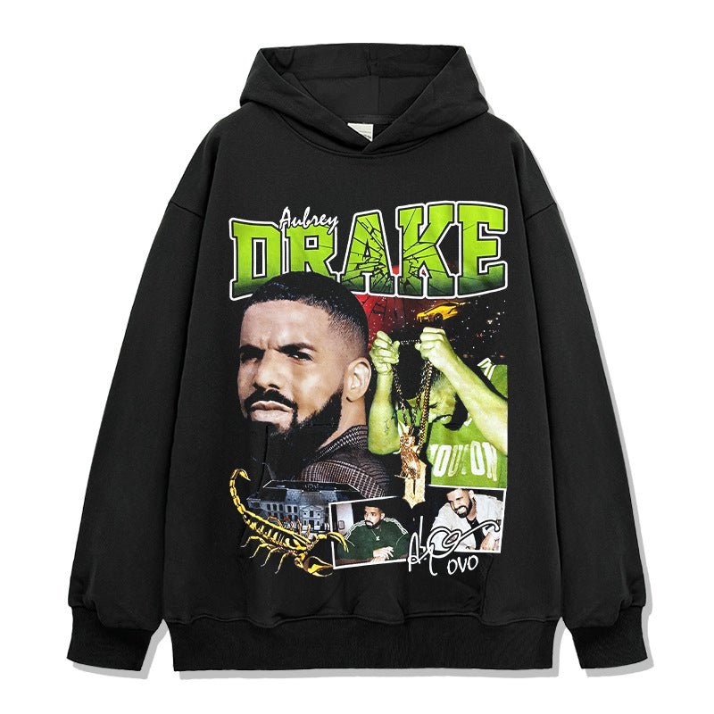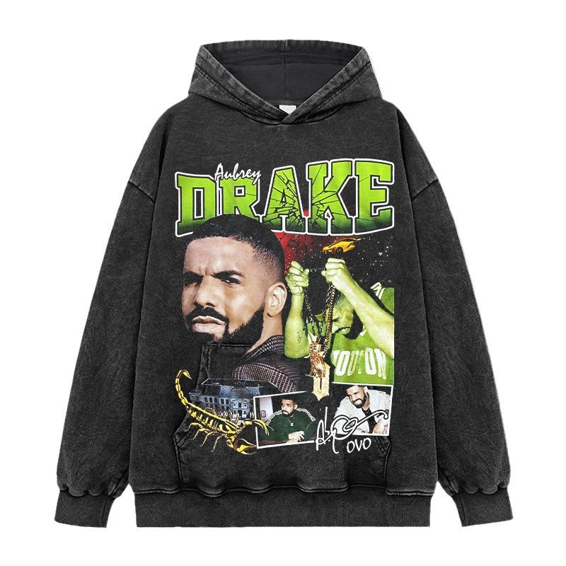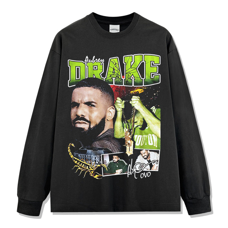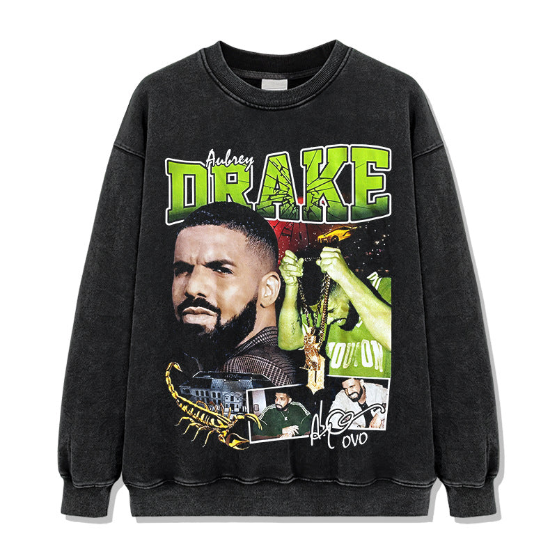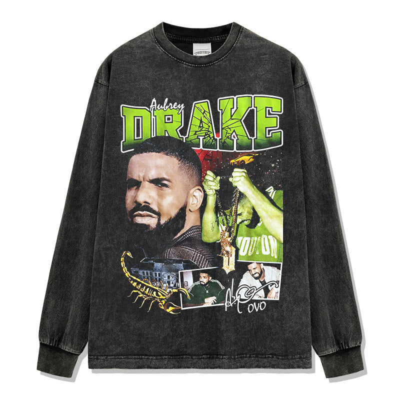 Vintage Drake Printed Short Sleeve T-Shirt Washed Old Long Sleeve Loose Hooded Sweater Men