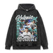 Retro-inspired graffiti letter prints and patch decoration at hem.