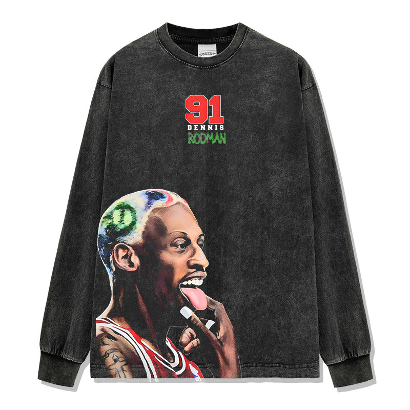 Vintage Rodman Printed T-Shirt Washed Long Sleeve Crew Neck Old Short Sleeve Hooded Sweater Men