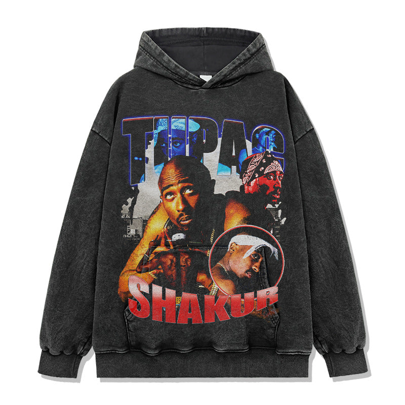 Vintage trendy TUPAC printed short-sleeved t-shirt washed and old long-sleeved loose hooded sweater men