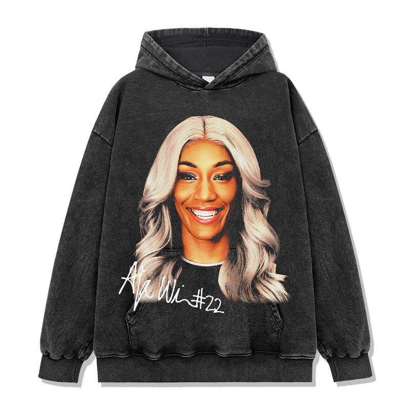 Vintage Wilson A'ja Printed Short Sleeve T-Shirt Washed Long Sleeve Crew Neck Loose Hooded Sweater Men
